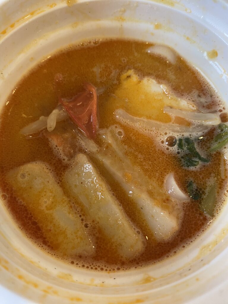| ひとこと | セブンイレブンのラクサを食べてみました♪ パッケージには「エビとスパイスのココナッツスープ」とあり、スープだけだと思い、自分で米めんを足そうかなと思ったのですが…最初から入ってました!底面のラベルをよく見ると「ビーフン」と書かれていました。うれしい驚きです。 最初ひと口食べたときは「少し薄い?」と思ったのですが、よく混ぜてみると底に濃厚なえび風味のスープがたっぷり。しっかり混ぜたら、ぐっとおいしさが引き立ちました♪ 具材も思った以上に充実していて、プリプリのかわいいエビまで入っているのが嬉しいポイント。最後は残ったスープにごはんを投入して、ラクサ雑炊にして締め。大満足の一杯でした☆ |